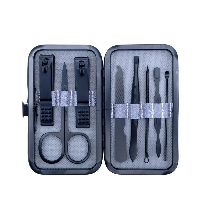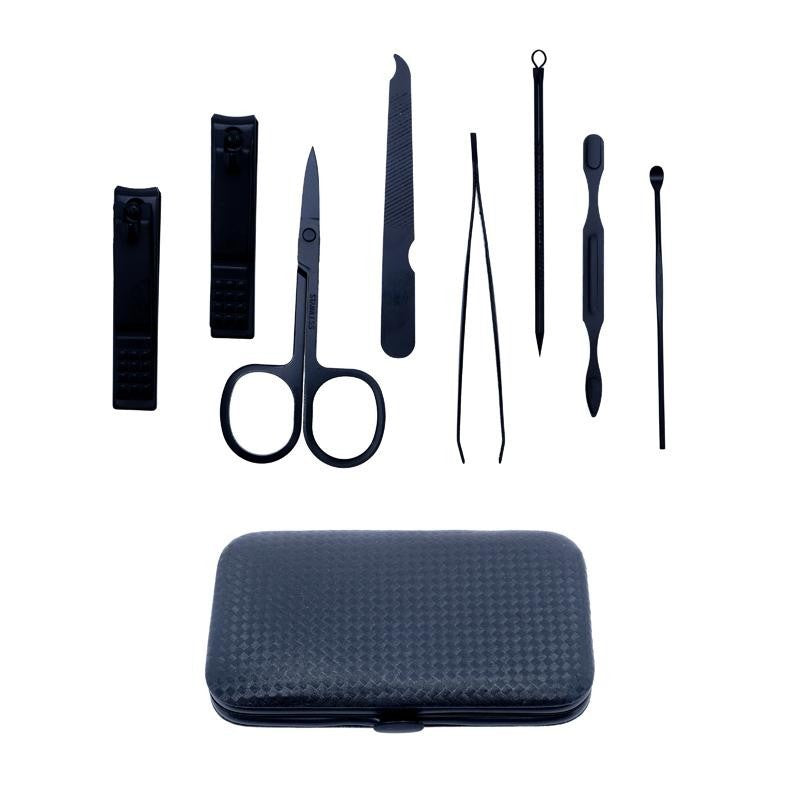 Set Includes: Scissors 8.7cm, Angled Nail Clipper 6cm, Nail Clipper 5.8cm, Tweezers 8.7cm, Double-ended Cuticle Pusher 7.5cm 7.5cm, Earwax remover Pick 7.5cm, Nail File 8.3cm, Blackhead/Acne Needle 8.5cm