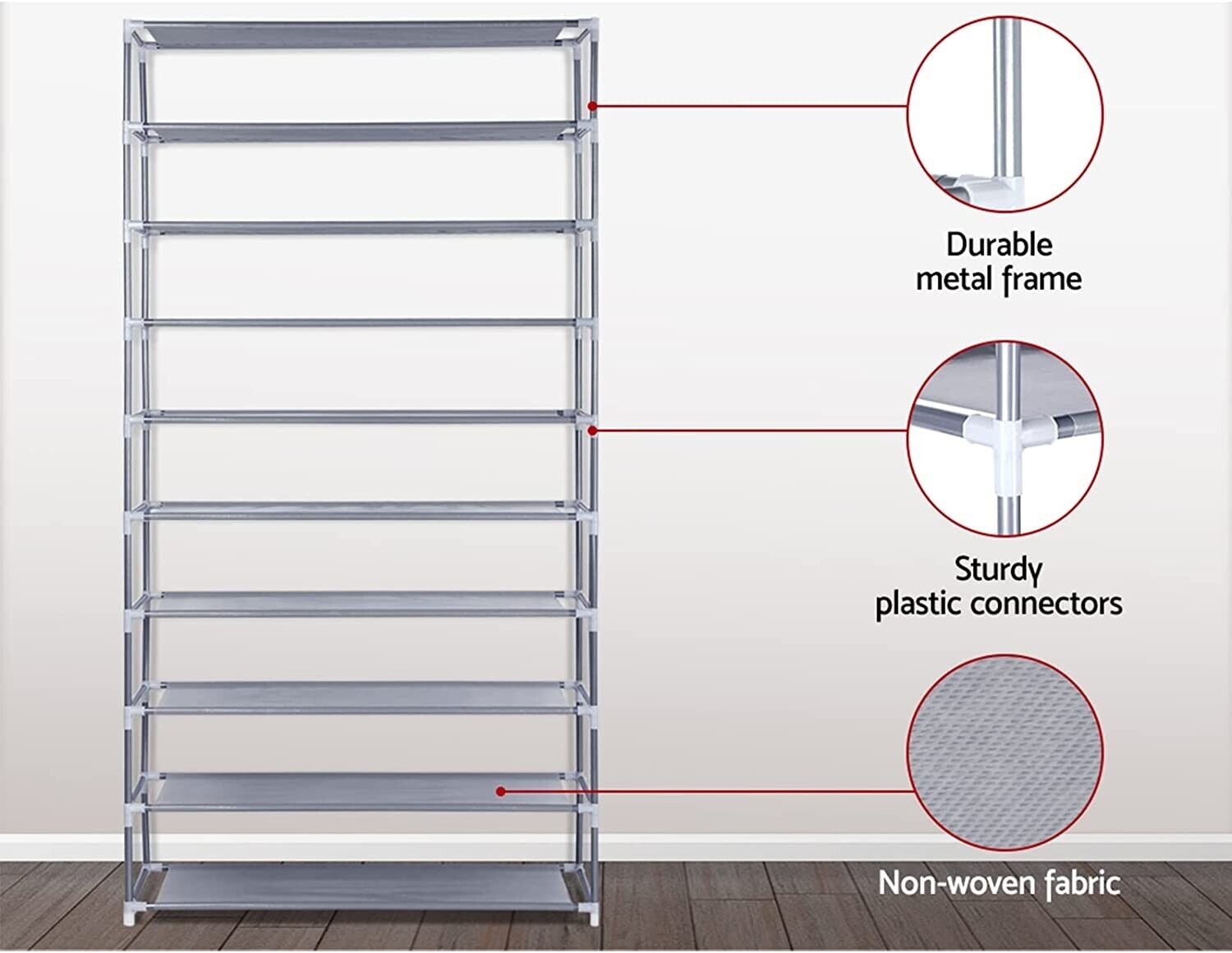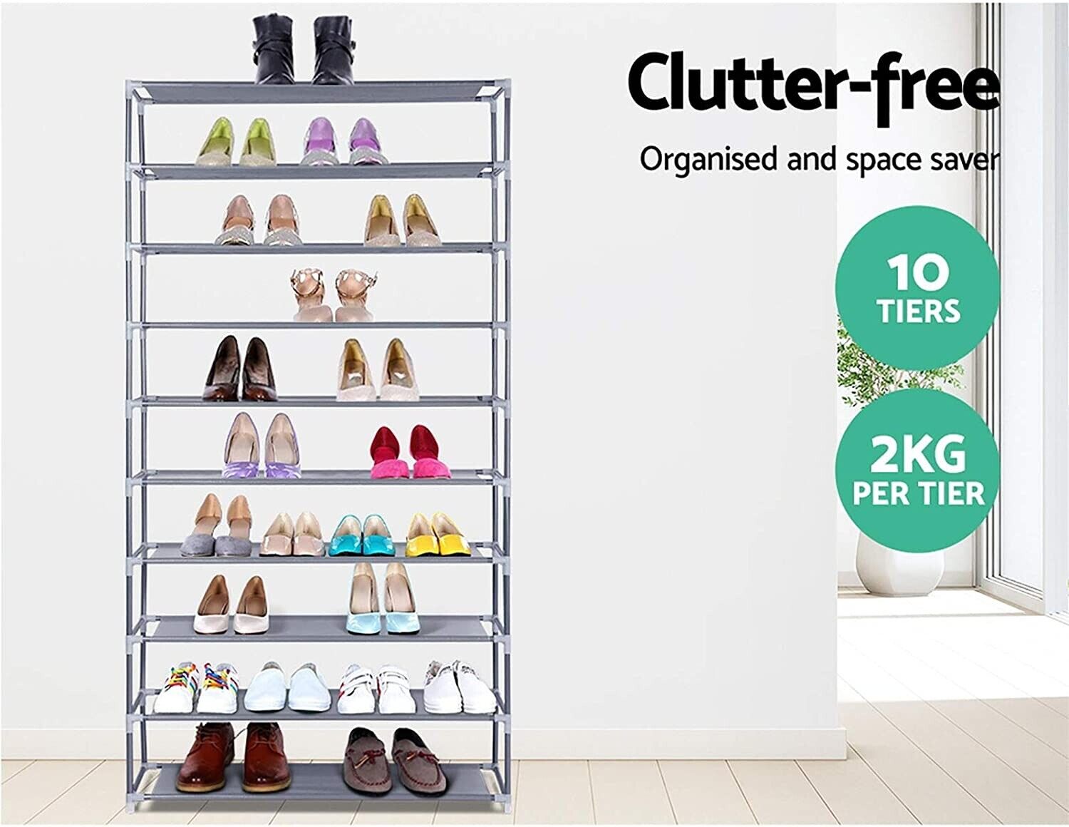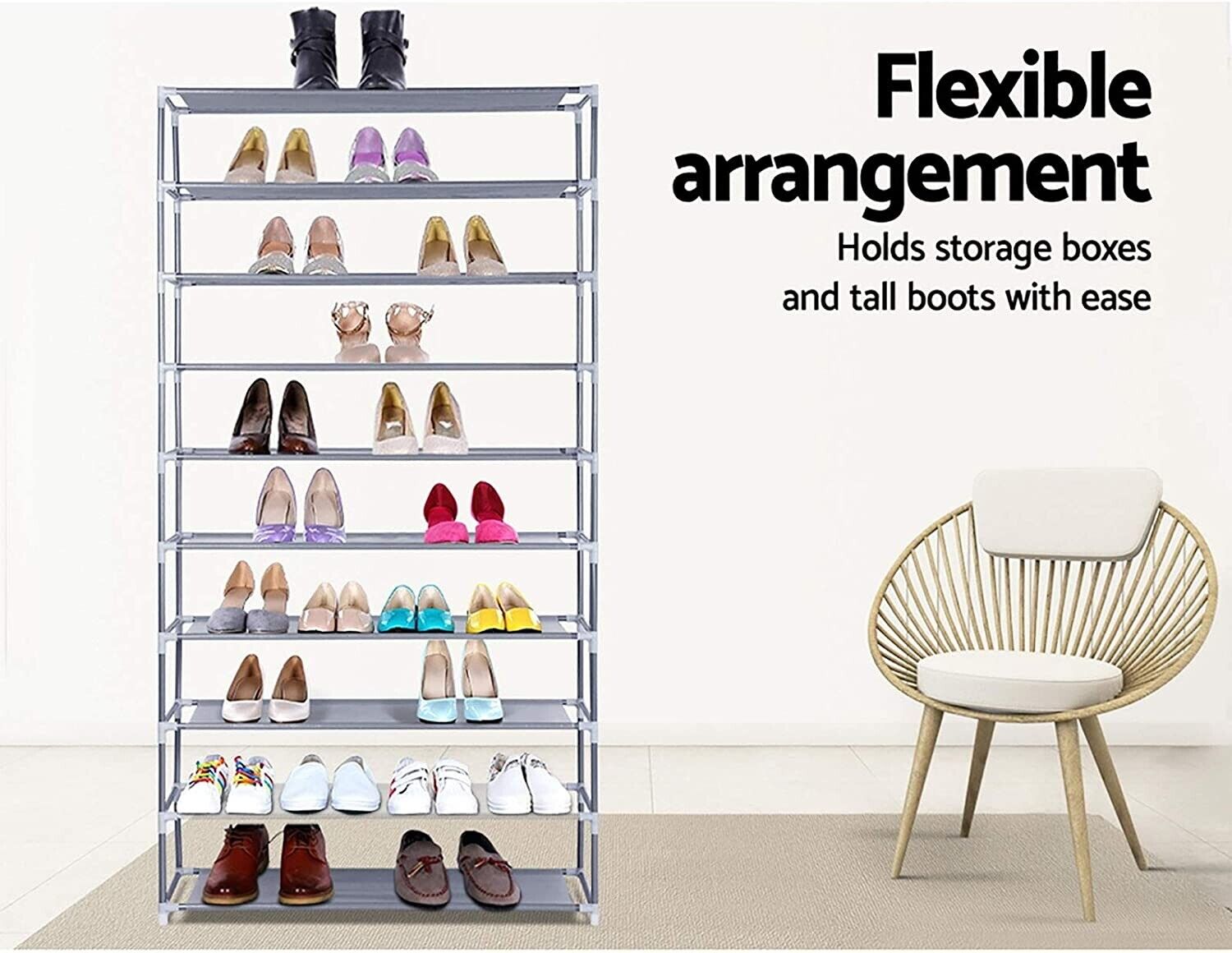 - The mother of all shoe racks, our tall shoe rack features a 10-tier rack that towers above ordinary racks. Each rack can handle up to 2kg in weight capacity.