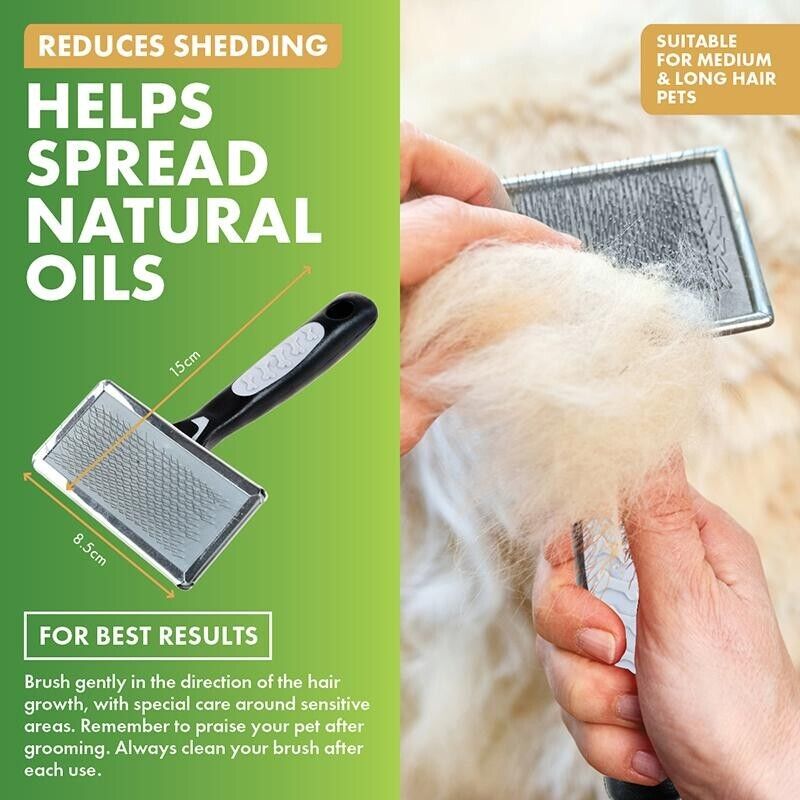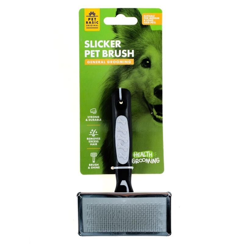 The Pet Basic Slicker Brush separates and lifts the hair away from the body and gives your pet`s skin a chance to breathe while also giving the coat a fuller appearance.