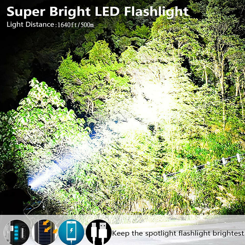 - 【SUPER-BRIGHT SPOTLIGHT】The ultra-long range maximum beam distance up to 500m. Very high brightness, long distance, up to 90000 high lumens. Led flashlight enough to illuminate the darkness of the entire night and provide you with a bright light world, with a lifetime of up to 50,000 hours. Spotlight flashlight can last 6 hours of run time in high mode, Medium and low mode run times can be used for 10 hours.