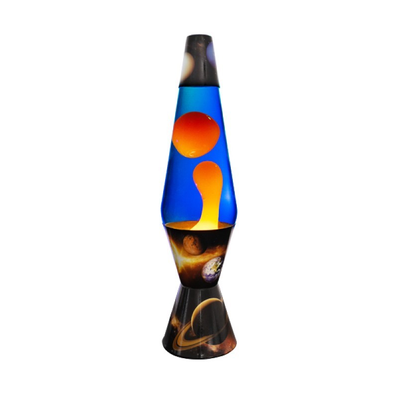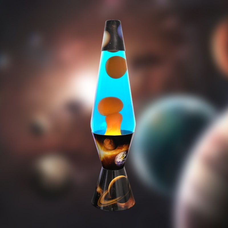 Features a blue glass body with yellow lava that swirls and ripples when lit