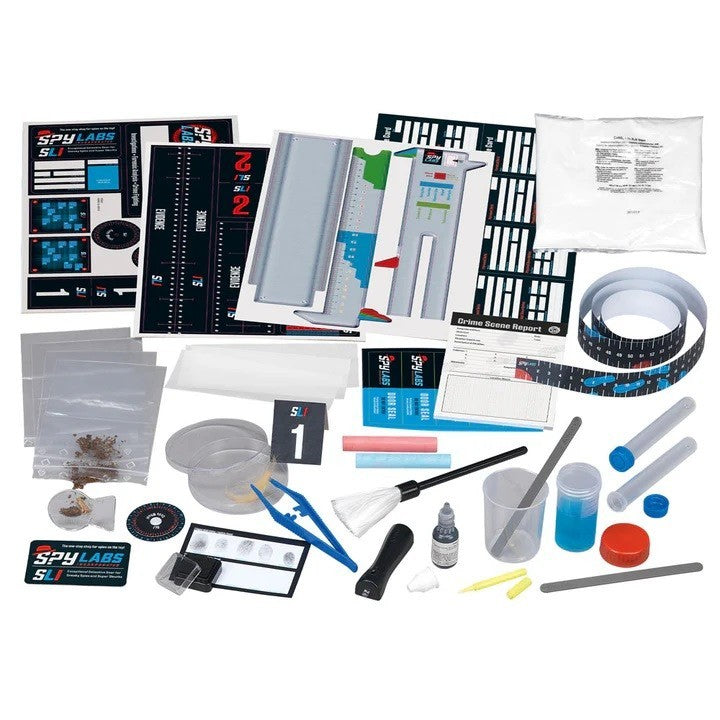 Welcome to Spy Labs Incorporated, the one-stop shop for spies on the top! With this well-equipped toolkit, you can learn how detectives use forensic science to answer questions, gather evidence, and solve crimes. Experiment with the equipment and techniques used by real detectives to develop your own observation and problem-solving skills. First, you will set up your detective’s office and organize your tools. Then, you will do some exercises to hone your observation skills. Next, you will learn about securing a crime scene, and gathering and documenting evidence, including fingerprints, footprints, and tire tracks. After you have gathered evidence, such as hair and fibers, counterfeit currency, and soil samples, you will head back to the lab to learn how to analyze it. Finally, you can try your hand at deciphering codes, writing messages with invisible ink, and communicating with secret symbols. As your skills develop, you can use them to solve the practice cases.