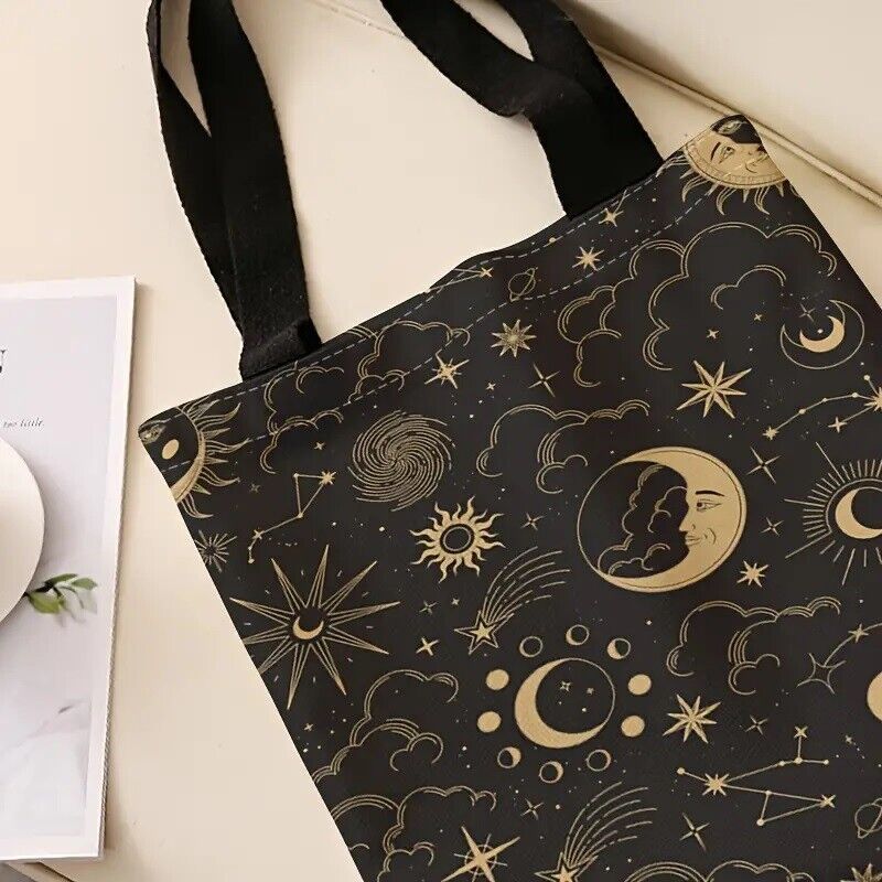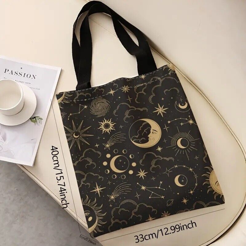 Sun And Moon Pattern Printed Casual Tote Bag, Lightweight Grocery Shopping Bag, Aesthetic Shoulder Bag For School, Travel