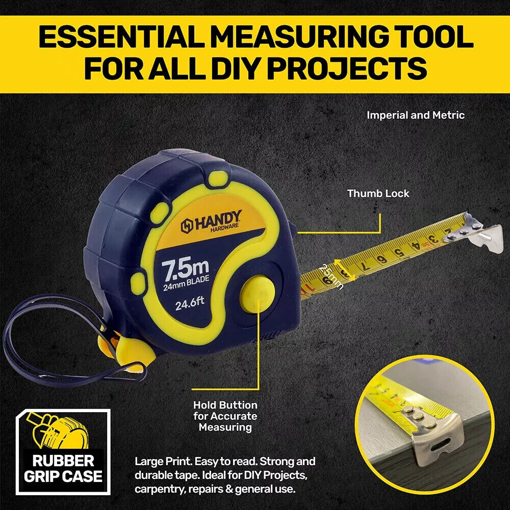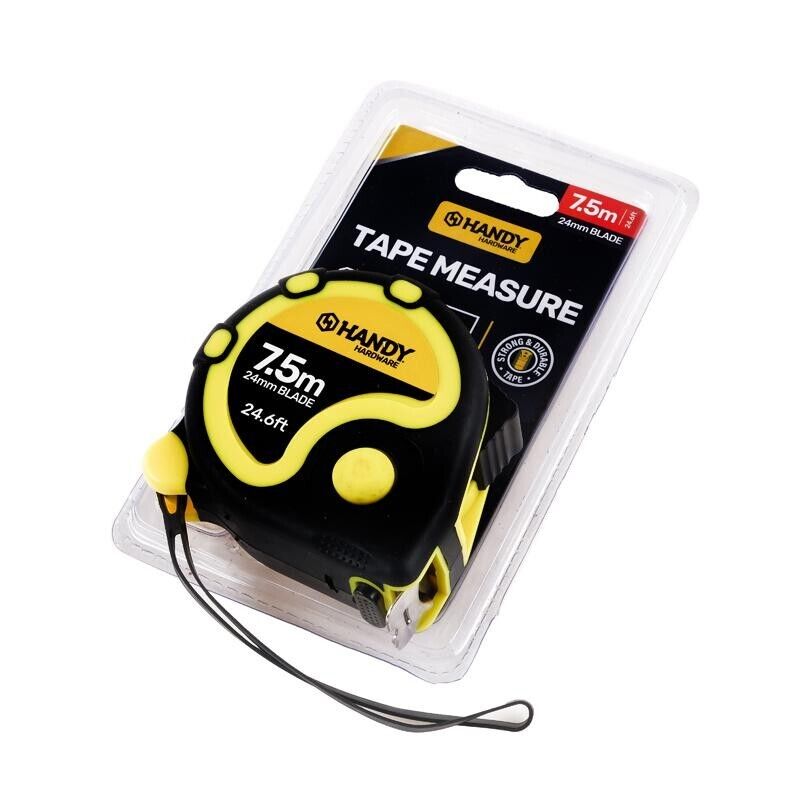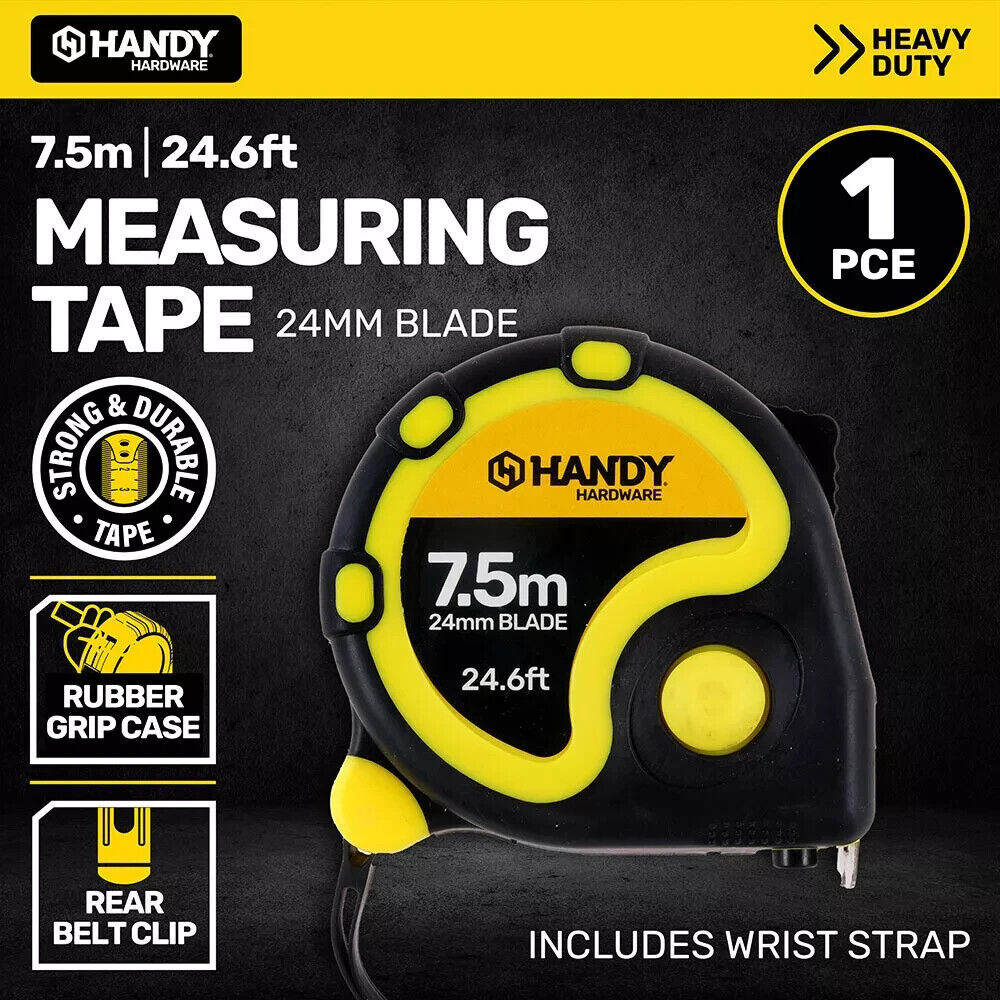 Handy Hardware 7.5M Heavy Duty Retractable Measuring Tape 3 Lock Mechanism.‚ Used for‚ maximum durability and reduced blade breakage. Ideal for industry professionals and home DIY enthusiasts alike, it has a cushion grip built into the case for a comfortable, non-slip grip and better impact resistance.