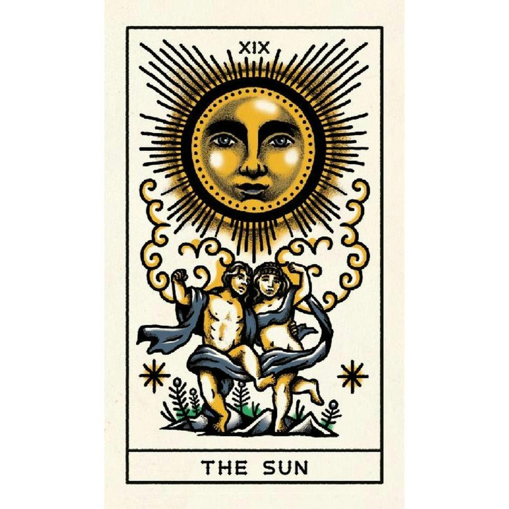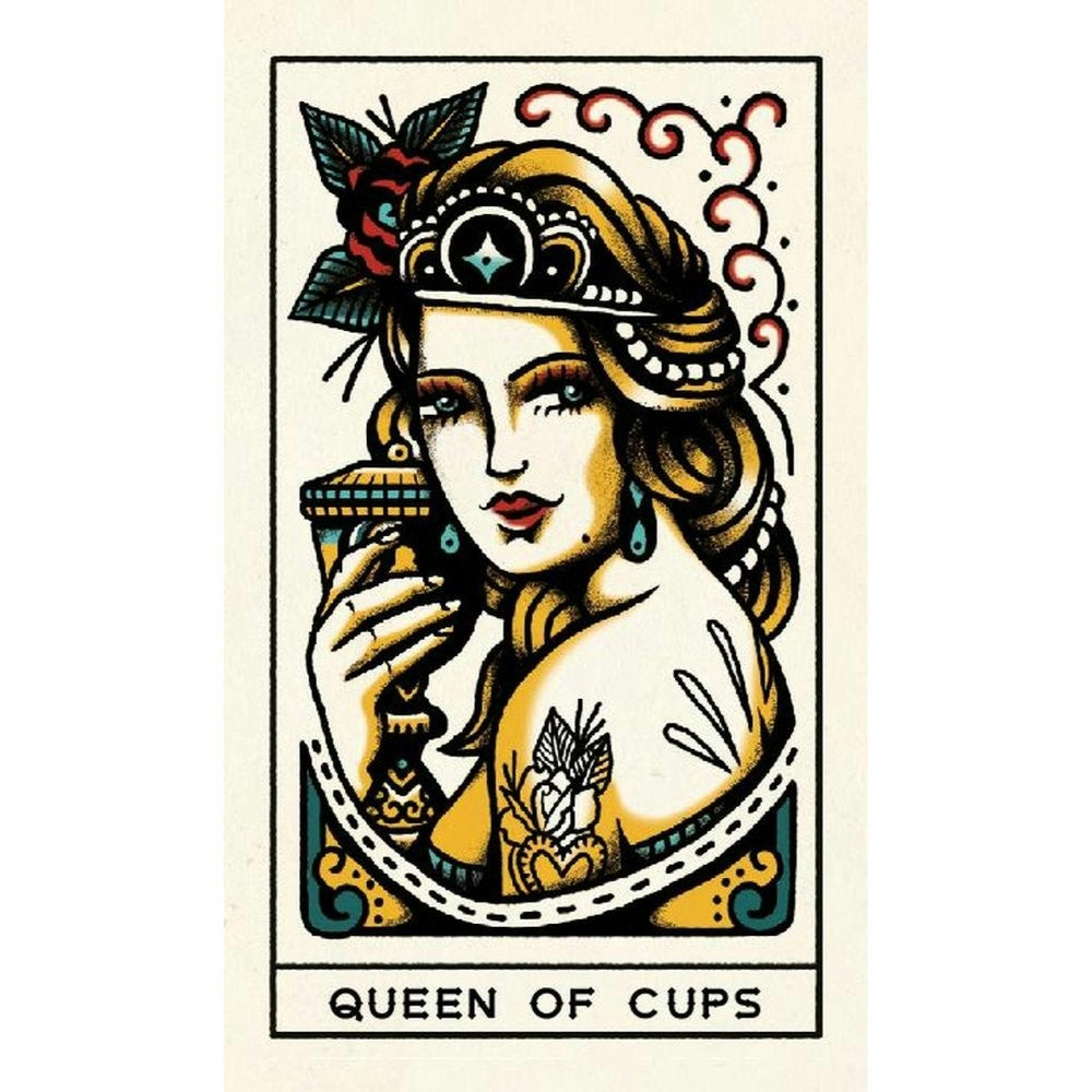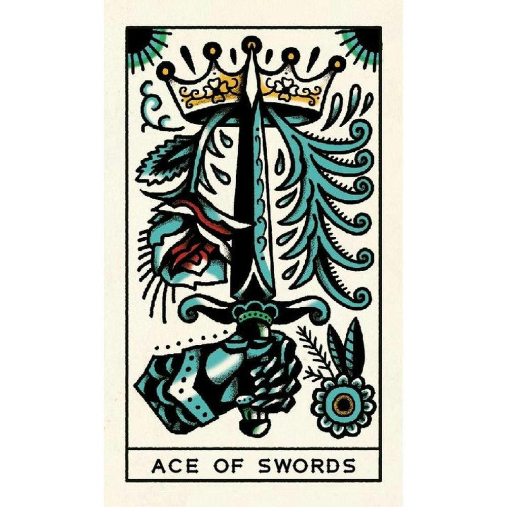 A beautifully illustrated set of tarot cards featuring vintage tattoo designs, in a convenient palm-sized deck.