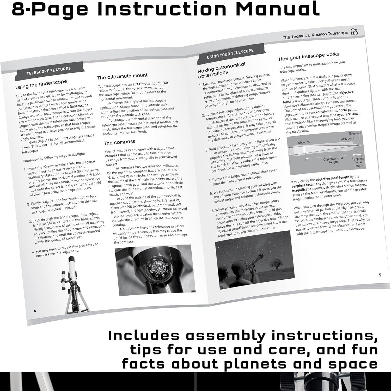 Observe the Moon and its craters, Mars, Saturn, Jupiter, plus countless terrestrial observations!.An 8-page instruction manual guides setup and use of the telescope, including tips for cleaning and caring for this essential scientific instrument.
