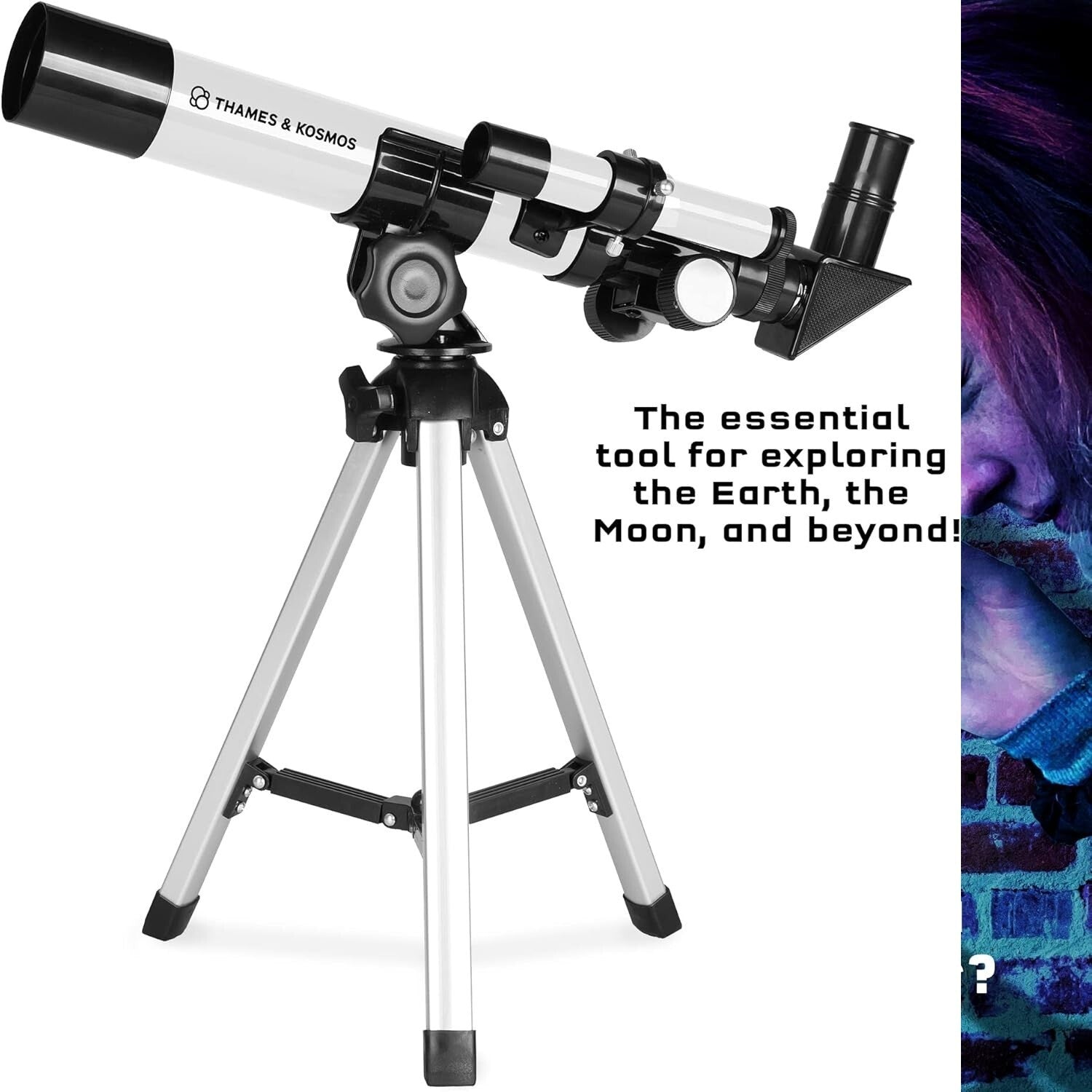 Set your sights on the Moon and beyond! With this excellent entry-level telescope, Thames & Kosmos continues a long tradition of inspiring people to reach for the stars. This high-quality refractor telescope with glass optics allows for countless exciting space observations. With it, you can see the Moon and its craters in good detail; Mars, Saturn, Jupiter, and more! Terrestrial observations on Earth are also possible. The included instruction manual guides you through setting up and using the telescope.