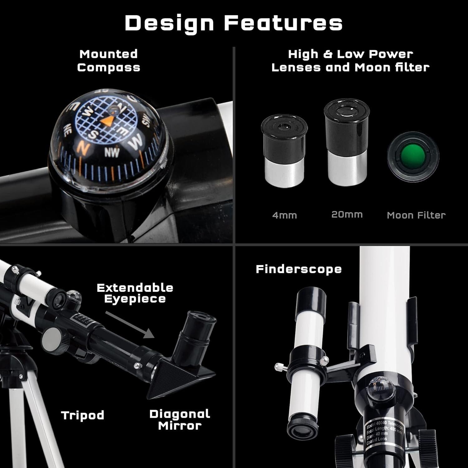 Refractor telescope boasts high-quality glass optical lenses, 400-mm focal length, 40-mm objective lens, aluminum tube, dew shield, and a precision focus adjustment knob.