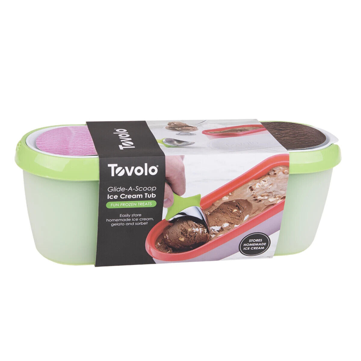 Tovolo Glide-A-Scoop Ice Cream Tub neatly stores homemade ice cream, gelato, and sorbet. Non-slip base steadies the container while you effortlessly scoop along with the slender tub. Slim design to fit into any tightly packed freezer or freezer door.