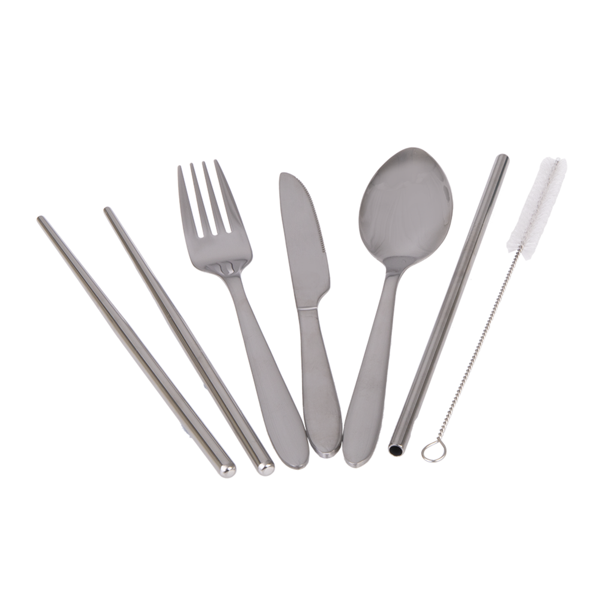 This set includes a knife, fork, spoon, set of chopsticks, drinking straw and straw cleaning brush in a handy, deluxe neoprene travel pouch, perfect for your handbag or backpack.