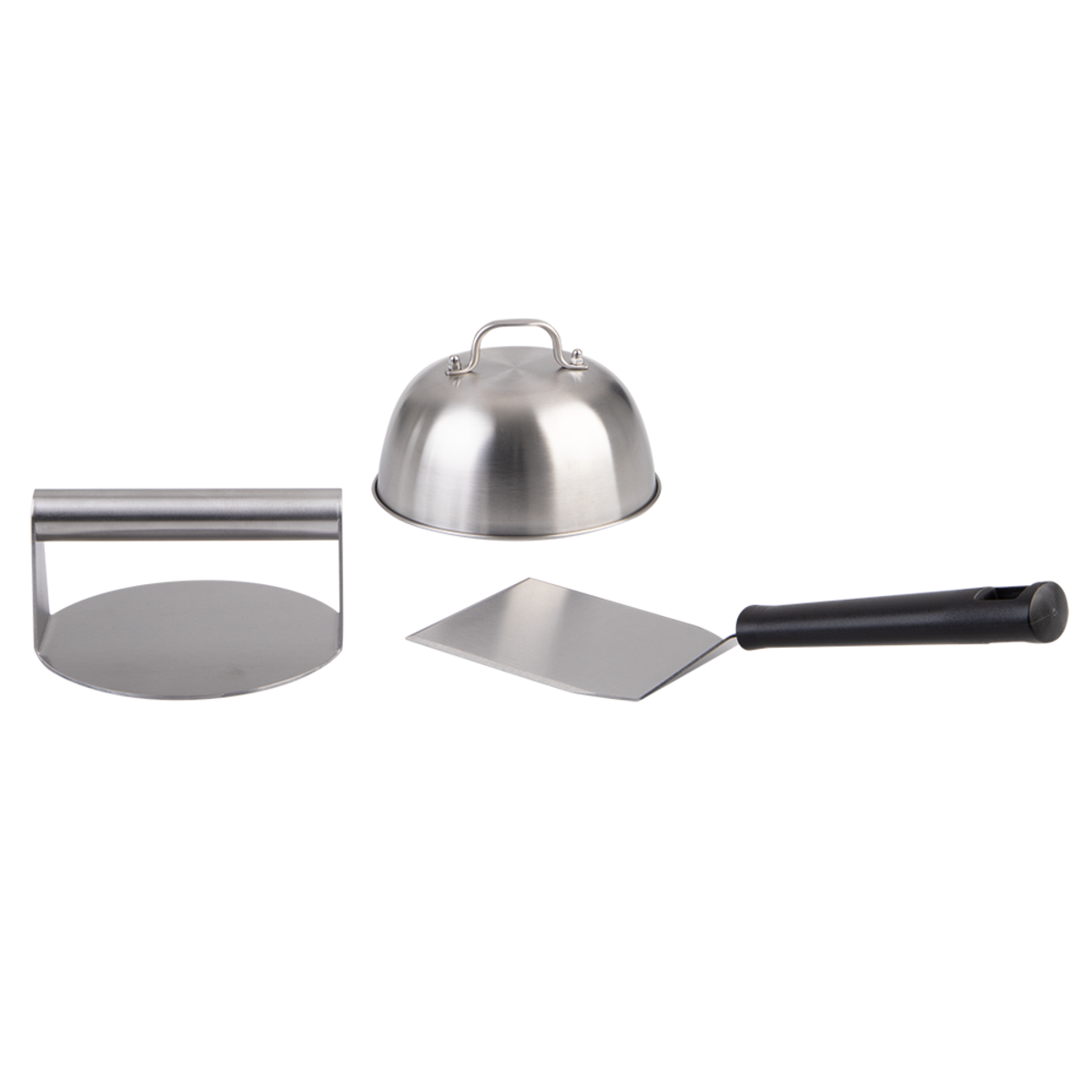 This set includes a Stainless Steel BBQ Spatula for precision flipping, a Stainless Steel Smash Patty Press for those irresistible crispy edges, and a Stainless Steel Cloche to lock in heat and melt cheese like a pro. Perfect for any grill lover ready to turn up the heat and serve burgers that mean business.