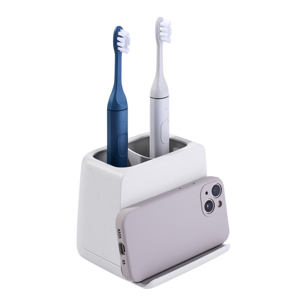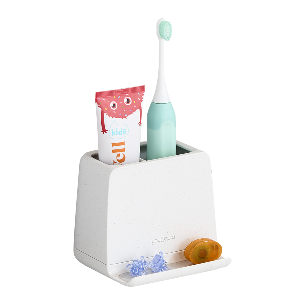 The YouCopia Ledge™ Toothbrush Holder is your oral hygiene HQ. With two spacious compartments, it holds both manual and electric toothbrushes, while cord slots accommodate chargers, too. The padded front ledge provides a landing spot for phones, floss, eyeglasses and jewellery. With antimicrobial treatment, removable drip tray and dishwasher-safe parts, cleaning is easy. This clever toothbrush holder keeps oral care essentials organized for a better brushing experience.