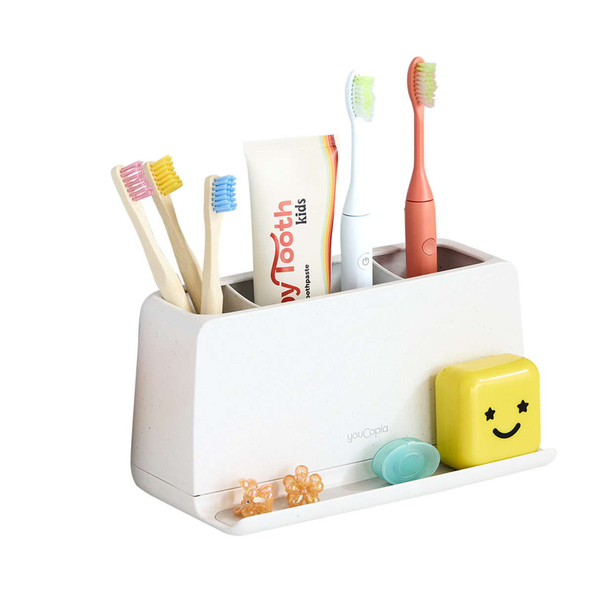 The YouCopia Ledge™ Toothbrush Holder is your oral hygiene HQ. With three spacious compartments, it holds both manual and electric toothbrushes, while cord slots accommodate chargers too. The padded front ledge provides a landing spot for phones, floss, eyeglasses and jewellery. With antimicrobial treatment, removable drip tray and dishwasher safe parts, cleaning is easy. This clever toothbrush holder keeps oral care essentials organized for a better brushing experience.
