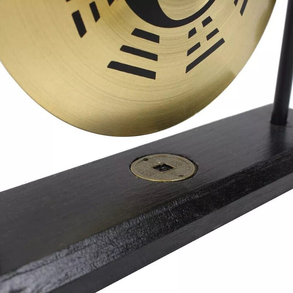 Consists of wood base and frame, and a copper gong was hang up by strings, the mini cute gong can be place on the flat countertop.